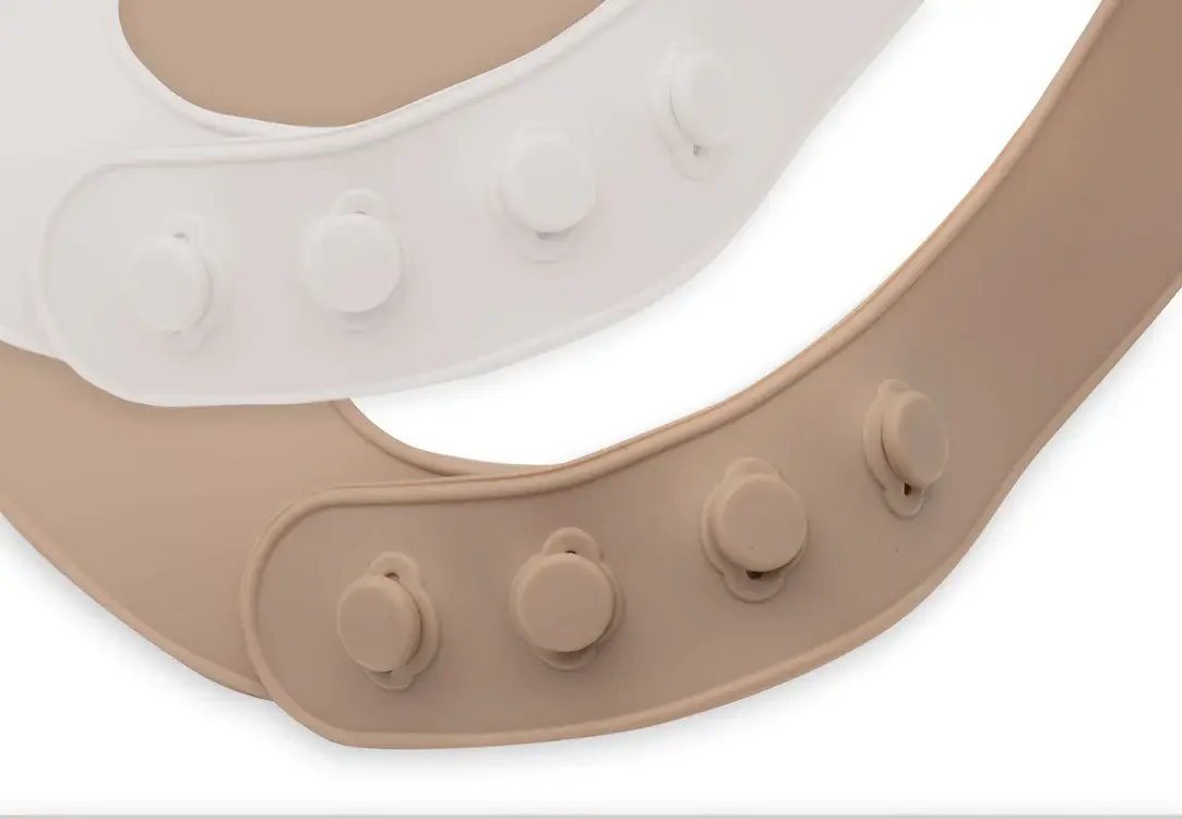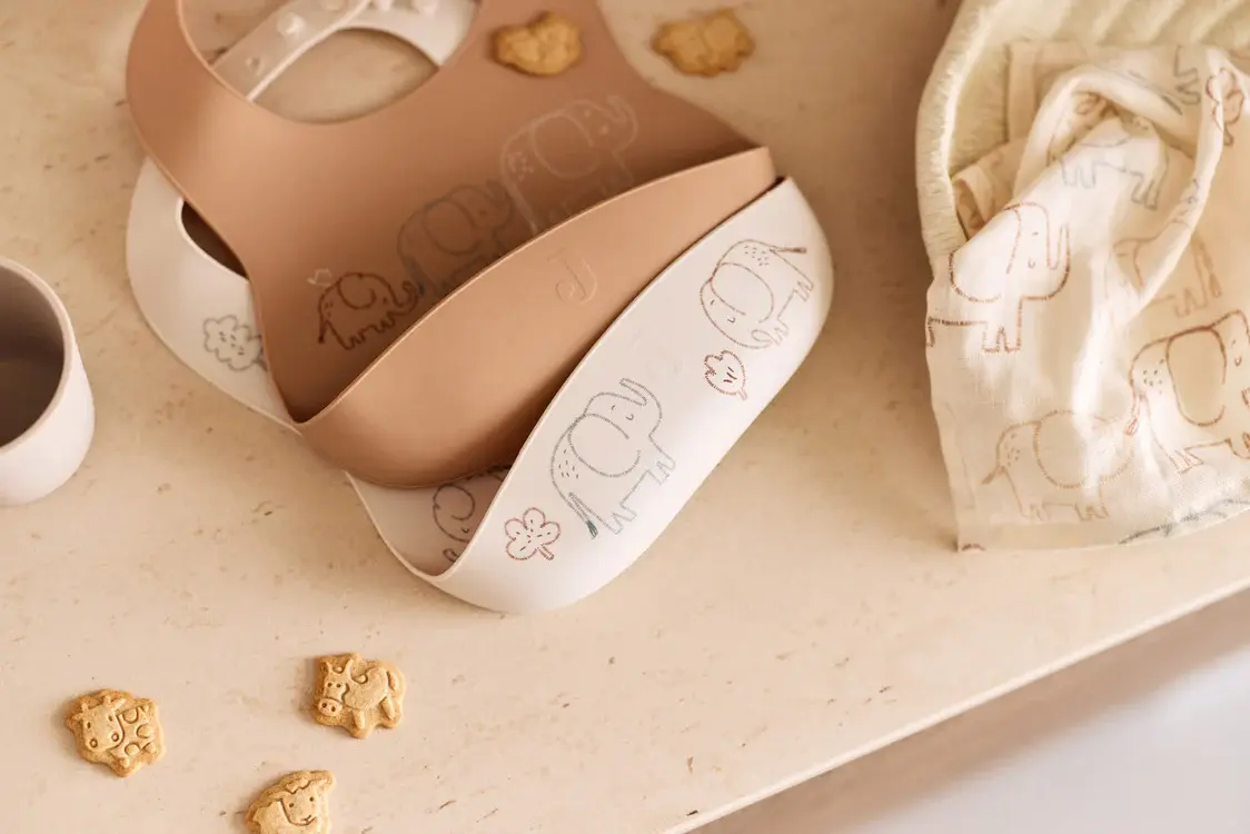 Deze set van twee siliconen slabbetjes uit de Elephant Tales collectie is perfect voor je kleintje. Het ene slabbetje heeft een schattige all-over print met olifantjes op een oatmeal ondergrond, terwijl de andere slab een biscuit kleur heeft met losse olifantjes. Beide slabbetjes zijn gemaakt van flexibel en gemakkelijk schoon te maken siliconen, ideaal voor de eerste maaltijden samen.