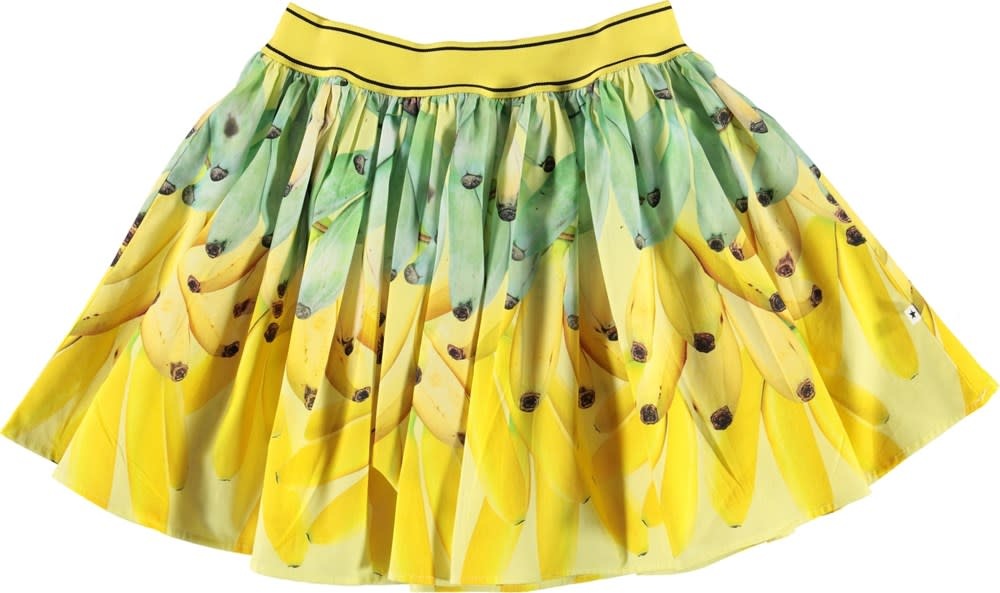 Go bananas in de Brenda rok met een gele en groene bananenprint. De rok heeft een gele elastische taille met dunne zwarte strepen.